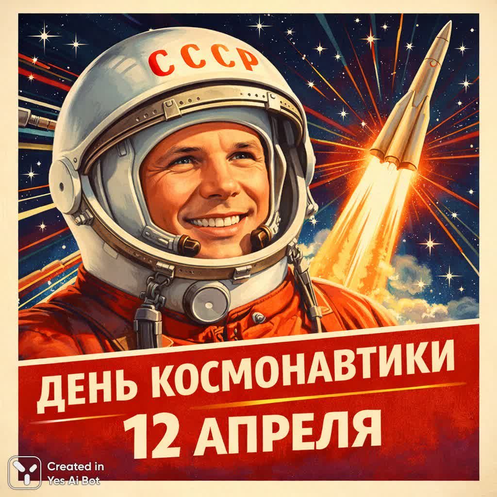 Открытка в стиле советского плаката: улыбающийся Юрий Гагарин в легендарном скафандре с надписью СССР на шлеме, позади него звёздное небо, ракета взмывает ввысь, вокруг сияние и динамичные линии, внизу крупная надпись на русском языке “День космонавтики 12 апреля”, вся композиция пропитана духом героизма, мечты о космосе и атмосферой старой советской иллюстрации, словно привет из эпохи великих свершений.