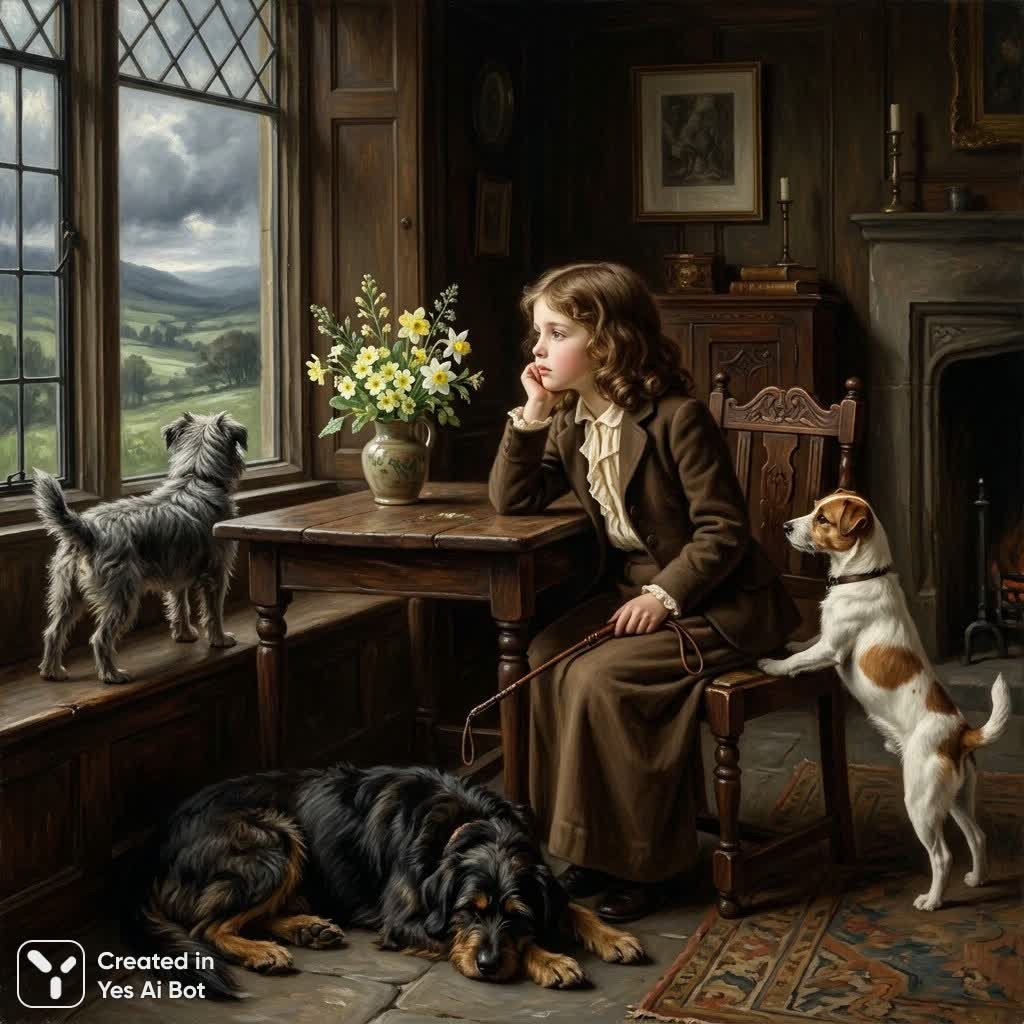 Загадочная сцена из мира викторианской эпохи запечатлевает юную девушку в момент задумчивости и ожидания. Восьми или десяти лет отросток, с роскошными волнистыми каштановыми волосами, склоняется над темным деревянным столом, ее широко раскрытые глаза устремлены к окну, за которым простирается таинственный туманный пейзаж. Выражение лица девочки исполнено любопытства и легкой тоски, словно она предвкушает что-то важное или вспоминает о прошлом. Ее наряд – нежный блузон с воротничком, коричневый приталенный жакет и длинные кожаные перчатки – подчеркивает ее статус и элегантность. Рядом валяется изящная плеть, добавляющая образу интриги и намека на скрытую силу. Вокруг девочки собрались верные спутники: огромный черный с коричневым псом, спокойно лежащим у ног; пушистый серый пес, заглядывающий через край стола; и энергичный Джек Рассел терьер, стоящий позади нее и смотрящий в ту же сторону. Внутреннее помещение украшено вазой нежных желтых цветов, а мягкий свет, проникающий сквозь окно, деликатно освещает девушку и ее четвероногих друзей, создавая контраст с темным фоном и полумраком комнаты. Композиция картины, выполненная в технике среднеформатного съемки, подчеркивает фигуру девушки, обрамленную собаками, а стиль живописи напоминает академическую школу XIX века с ее богатыми текстурами и мрачной атмосферой повествования. Картина дышит спокойствием и одновременно таит в себе неразгаданную тайну