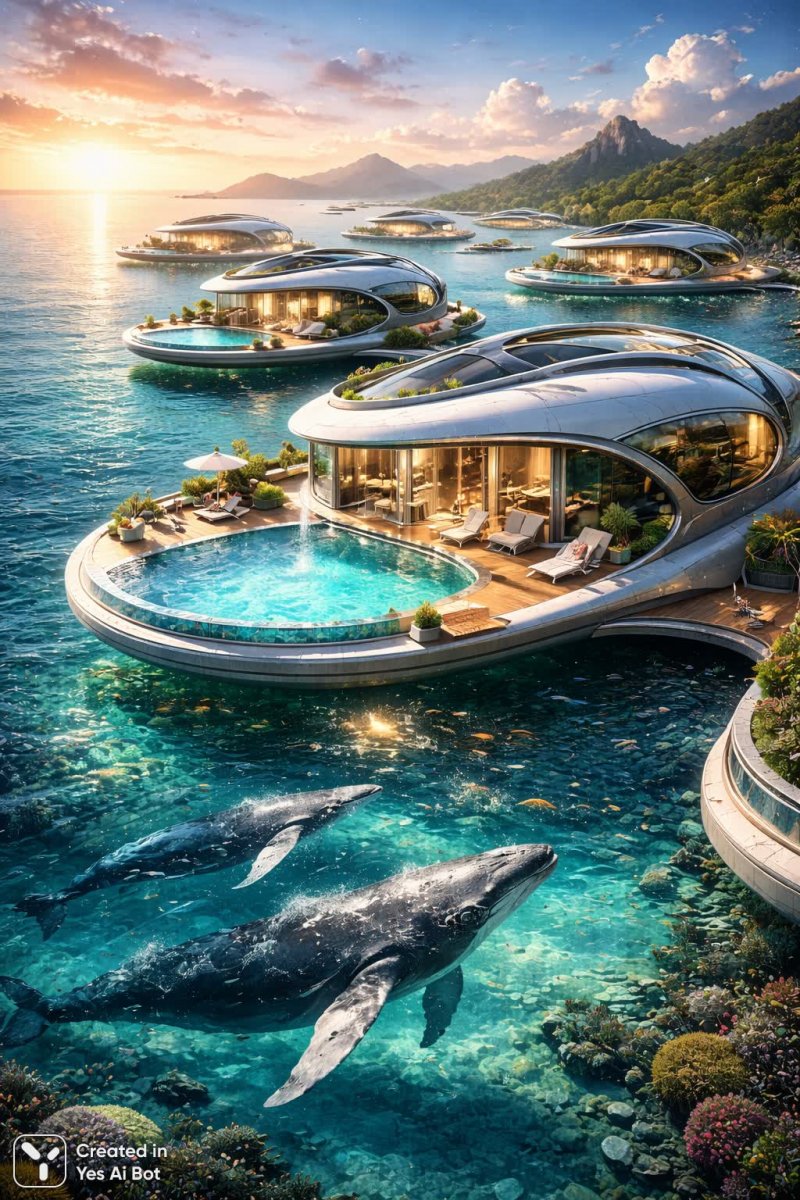 Представьте себе утопию на волнах – коллекцию уникальных домиков-отелей, где переплетаются футуристический дизайн и гармония с морем. Это не просто жилье, это концепция зодчества будущего, воплощенная в элегантных формах, словно выросших из морской стихии. Обтекаемые углы каждой конструкции подчеркивают плавность линий и создают ощущение невесомости над водой. Каждый домик – это персональное пространство с собственным бассейном, где можно наслаждаться уединением и кристально чистой водой. Хромированный металл блестит на солнце, отражая блики волн и придавая сооружениям неповторимый шарм. Внимание к деталям поражает: реалистичные изображения китов украшают фасады, словно приглашая гостей в мир морских приключений. Эти домики-отели – это симфония стиля и инноваций, где современные технологии сочетаются с уважением к природе и создают атмосферу роскоши и безмятежности. Это идеальное место для тех, кто ценит эксклюзивность и стремится к новым впечатлениям, желая погрузиться в мир элегантности, комфорта и захватывающих морских пейзажей. Каждый элемент дизайна проработан до мелочей, чтобы обеспечить максимальный уровень комфорта и эстетического наслаждения, создавая незабываемые воспоминания о пребывании в этом уникальном месте. Это настоящее произведение искусства, которое гармонично вписывается в окружающую среду и дарит ощущение полного единения с морем