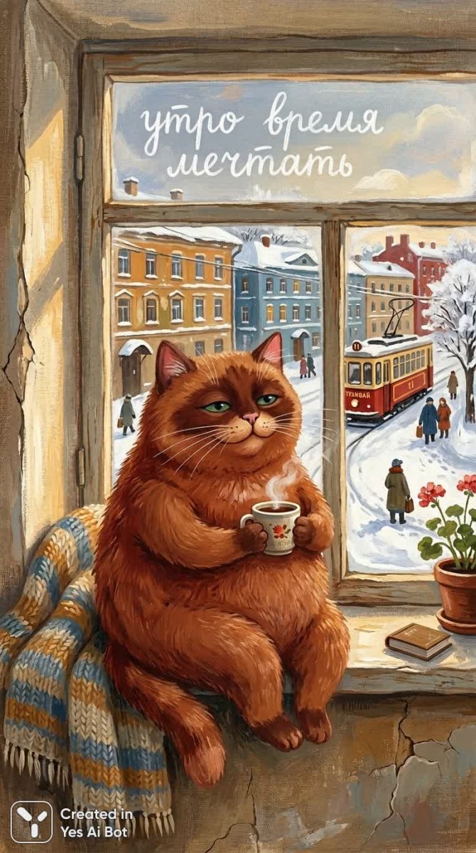 Нежная акварельная иллюстрация в наивной манере изображает очаровательного пухлого рыжего кота, уютно расположившегося на залитом солнечным светом подоконнике. Это фронтальный портрет в три четверти, демонстрирующий округлое тело и густую шерсть насыщенного ржавого оттенка с едва заметными темными полосками. Большие сонные изумрудные глаза смотрят с ленью и спокойствием, а крошечные розовые треугольные ушки слегка приподняты. Длинные белые усики добавляют коту особого обаяния. В лапке он держит дымящуюся кружку, рядом небрежно наброшена теплая вязаная плед. Потрескавшийся известковый подоконник служит фоном для заснеженной улицы и проезжающего трамвая за окном. Теплое золотое утреннее освещение создает атмосферу уюта и безмятежности. Текстурные мазки кисти и видимая зернистость холста придают работе особую фактурность, а фольклорный примитивный стиль подчеркивает простоту и искренность изображения. Мягкая приглушенная палитра с теплыми акцентами создает гармоничную цветовую композицию. В центре картины над котом расположена рукописная русская фраза белым шрифтом: 'утро — время мечтать', добавляющая произведению лиричности и философского смысла, приглашая зрителя окунуться в атмосферу утренней неги и мечтаний. Картина излучает тепло, спокойствие и ощущение домашнего очага