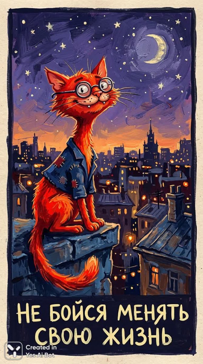 Яркий экспрессионистский постер в технике гуаши, воплощающий наивную ироничную атмосферу. В центре композиции – вытянутый, алый кот с игривой ухмылкой, восседающий на краю крыши на фоне сумеречного городского пейзажа. У кота длинная шея, его шерсть насыщенного малинового цвета с оранжевыми бликами словно искрится в закатном свете. На носу забавные круглые очки, а на спинке – крошечный поношенный темно-синий жакет, добавляющий образу обаяния и некоторой абсурдности. За спиной кота вырисовывается силуэт города с мерцающими огнями и звездное индиго-фиолетовое небо, украшенное стилизоватым полумесяцем. Художественный стиль отличается динамичными широкими мазками и ощутимой фактурой пастозного покрытия, создающей эффект объемности. Драматичное контровое освещение подчеркивает контуры кота и придает сцене глубину и выразительность. Композиция выдержана в духе плакатного искусства с использованием смелых пустот и акцентов. В нижней части постера нанесена рукописная русская надпись палево-желтым цветом, гласящая: 'не бойся менять свою жизнь'. В целом работа излучает причудливую энергию и заставляет задуматься о важности перемен в жизни, несмотря на кажущуюся несерьезность происходящего. Картина передает ощущение легкости, юмора и вдохновения, побуждая зрителя к смелым решениям и позитивным изменениям
