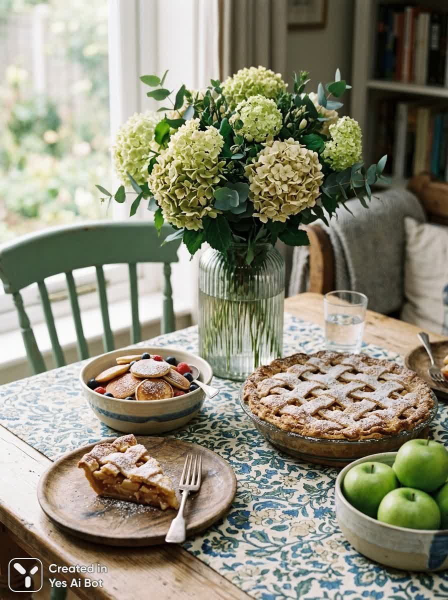 A still life featuring a large, round baked pie dusted with powdered sugar in a glass dish, a slice of pie on a wooden plate, a bowl of small pancakes, and a bowl of green apples. A tall, ribbed green vase filled with a bouquet of pale green hydrangeas is centrally located. The setting appears to be a table with a patterned tablecloth, with a green chair visible in the background. The lighting is soft and diffused, suggesting natural light from a window. The composition is a medium shot, with a slightly elevated perspective. The atmosphere is cozy and domestic