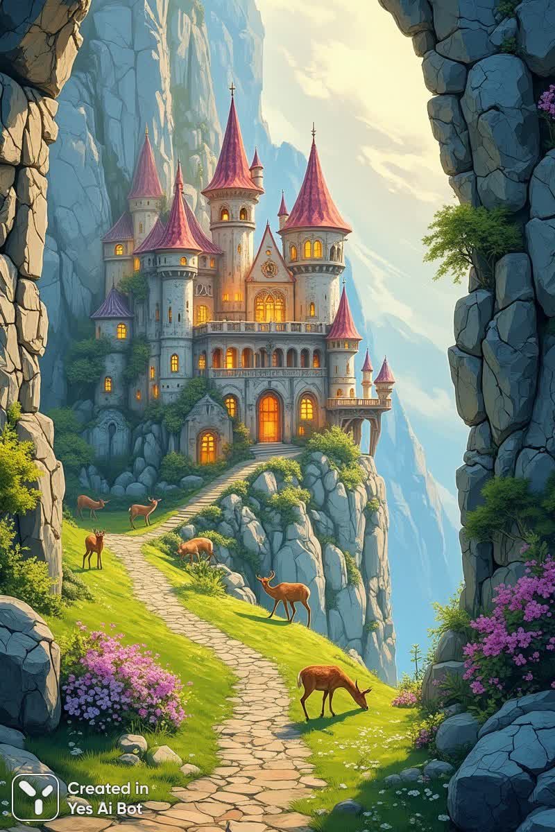 Сказочный дворец у подножия скал: волшебный пейзаж - Картинка, созданная ИИ Flux