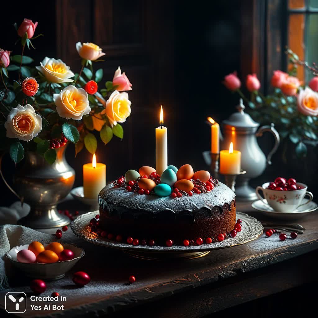 Изысканная пасхальная сцена, сотканная в манере Эндре Пеноваца, погружает зрителя в атмосферу уюта и светлой меланхолии. Интерьер наполнен мягким рассеянным светом, созданным благодаря технике сфумато, что придает изображению особую глубину и загадочность. В центре композиции – пышный кулич, украшенный яркими пасхальными яйцами, символизирующими возрождение и надежду. Вокруг царит атмосфера праздника: сверкающая мишура добавляет искр радости, а на заднем плане нежно колышутся плетистые чайные розы, создавая ощущение тепла и умиротворения. Небольшая горсть брусники привносит нотку природной свежести и натуральности в эту выдержанную композицию. Белая дымка, окутывающая пространство, словно акварель, добавляет легкости и воздушности, а мерцающее пламя свечи создает ощущение тепла и домашнего очага. Картина излучает спокойствие и благоговение, передавая дух весеннего обновления и пасхальной радости в гармоничном сочетании цветов и фактур. Это не просто изображение – это приглашение окунуться в мир утонченной красоты и светлых чувств, где каждый элемент тщательно подобран для создания неповторимой атмосферы праздника и тепла. Умиротворяющая картина, словно написанная шепотом, рассказывает историю о вечных ценностях и радости жизни