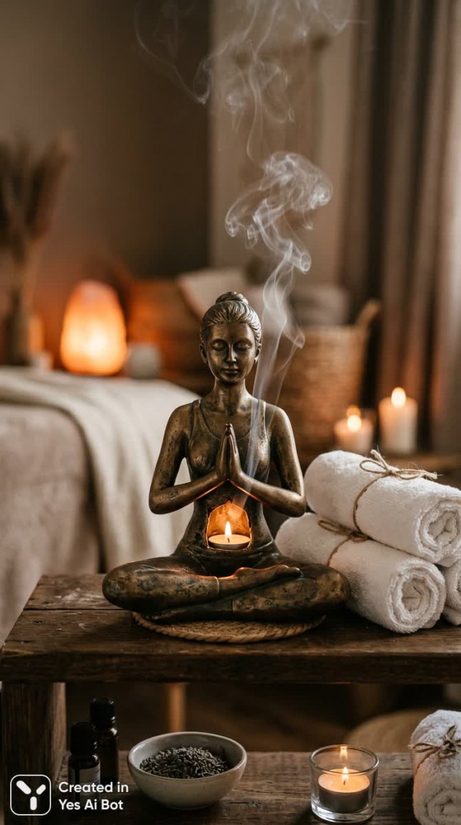 Теплое освещение подчеркивает общую обстановку спокойствия и релаксации, напоминающую спа-салон или уютный уголок для отдыха. Размытый фон акцентирует внимание на статуе и свече, позволяя детально рассмотреть текстуру бронзы, мягкость полотенец и тонкости дыма, погружая зрителя в атмосферу умиротворения.