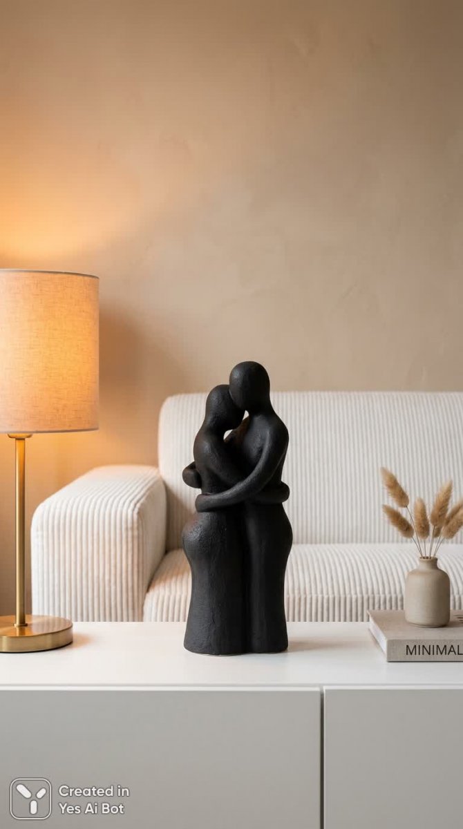 Современная скульптурная композиция изображает двух безликих фигур в объятии, символизируя близость и единение. Скульптуры выполнены в контрастных текстурах: одна – с черной фактурной поверхностью, другая – с вертикальными белыми ребрами, создающими визуальный интерес и подчеркивающим их индивидуальность, несмотря на тесную связь. Мягкий оранжевый свет окутывает скульптуры теплом, смягчая контраст между темными и светлыми элементами и добавляя ощущение уюта и интимности. Фон представляет собой гладкую бежевую стену, создающую спокойный и нейтральный фон, который не отвлекает внимание от основных объектов. Композиция расположена на белой поверхности, что усиливает ее минималистичный характер и подчеркивает простоту форм. Общий стиль декора выдержан в минималистичном ключе, с акцентом на чистые линии и спокойные цвета, создавая атмосферу элегантности и утонченности. Эта работа исследует темы человеческих отношений, близости и единства через абстрактную форму и текстуру, приглашая зрителя к размышлению о природе связи и взаимопонимания в современном мире. Скульптура передает ощущение тепла и спокойствия, а также отражает современный подход к искусству, где форма и материал играют ключевую роль в создании эмоционального воздействия