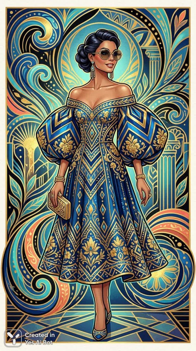 На иллюстрации в стиле ар-деко изображена элегантная женщина с темными убранными волосами и большими круглыми солнцезащитными очками, создающими атмосферу загадочности. Она одета в роскошное платье с открытыми плечами и рукавами геометрической формы, украшенными декоративными цветочными мотивами, формирующими уникальный орнамент. Динамичный фон состоит из закручивающихся сине-золотых вихрей, добавляющих глубину и визуальную привлекательность композиции. Яркая и насыщенная цветовая палитра подчеркивает живость иллюстрации, а образ женщины излучает уверенность и стиль, передавая атмосферу роскоши и утонченности, характерную для эпохи ар-деко. Картина создает ощущение праздника, элегантности и беззаботности благодаря яркости и оригинальности исполнения. Работа нейросети Nano Banana v.2.0 представляет собой произведение искусства, сочетающее красоту женской фигуры с изысканностью деталей и мастерством исполнения. Иллюстрация выполнена без использования специфического стиля и идеально подойдет для тех, кто ценит классический стиль с современными акцентами. Общий образ яркий и запоминающийся, вызывающий восхищение своей оригинальностью и детализацией.