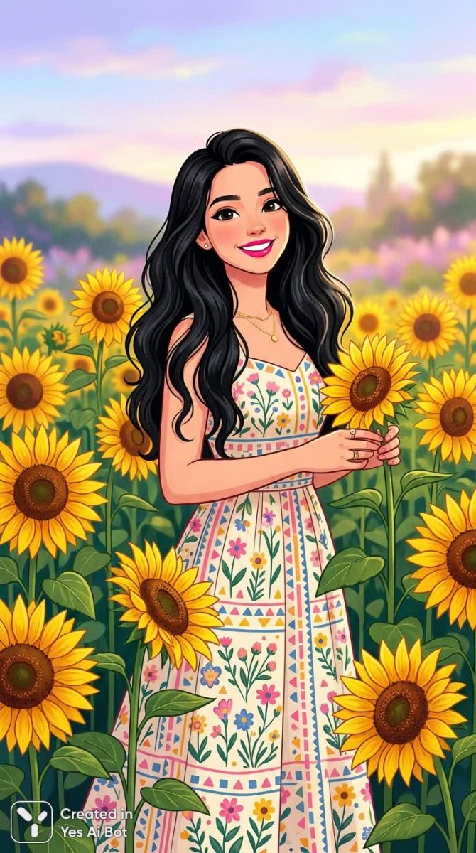 Изящная девушка в окружении ярких подсолнухов – воплощение летней безмятежности и современной элегантности. Её длинные волнистые черные волосы контрастируют с дерзким оттенком розовой помады, создавая запоминающийся образ. Легкое платье с цветочным принтом и геометрическими мотивами подчеркивает её утонченность, а минималистичные аксессуары добавляют образу лаконичности. Фон в пастельных тонах деликатно размыт, акцентируя внимание на девушке и буйстве красок подсолнухов. Высокая детализация изображения и современный иллюстративный стиль делают эту картину визуально привлекательной и запоминающейся. Это не просто портрет – это настроение, ощущение тепла и света, запечатленное в ярких цветах и плавных линиях. Работа излучает оптимизм и легкость, перенося зрителя в мир летних грез и солнечного настроения. Девушка словно оживает на фоне этого буйства красок, становясь символом красоты и гармонии с природой. Иллюстрация идеально подойдет для оформления тематических материалов, создания стильных коллажей или просто для украшения интерьера, наполняя пространство позитивной энергией и летним настроением. Она сочетает в себе классическую красоту и современные тенденции, создавая неповторимый визуальный эффект