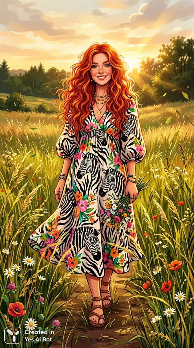 Яркая иллюстрация молодой женщины с огненно-рыжими волосами, ниспадающими волнами, создает впечатление силы и энергии. Ее образ завораживает сочетанием смелых узоров и нежной цветочной детализации. Свободное платье в черно-белую зебру добавляет динамики и дерзости, а цветочные акценты смягчают визуальный эффект, привнося нотку романтики и женственности. Женщина стоит посреди поля высоких трав, словно сливаясь с природой, а золотой солнечный свет, пробивающийся сквозь заросли, окутывает ее аурой тепла и загадочности. Высокий контраст цветов подчеркивает глубину и насыщенность изображения, делая его особенно выразительным и запоминающимся. Картина излучает оптимизм и жизнерадостность, притягивая взгляд своей красотой и гармонией. Это визуальный гимн молодости, свободе и природной красоте, воплощенный в ярких красках и детализированном исполнении. Художественное решение позволяет зрителю почувствовать себя участником этой волшебной сцены, ощутить тепло солнца на коже и вдохнуть аромат полевых цветов. Образ женщины вызывает ассоциации с силой духа и уверенностью в себе, что делает эту иллюстрацию не только красивой, но и вдохновляющей