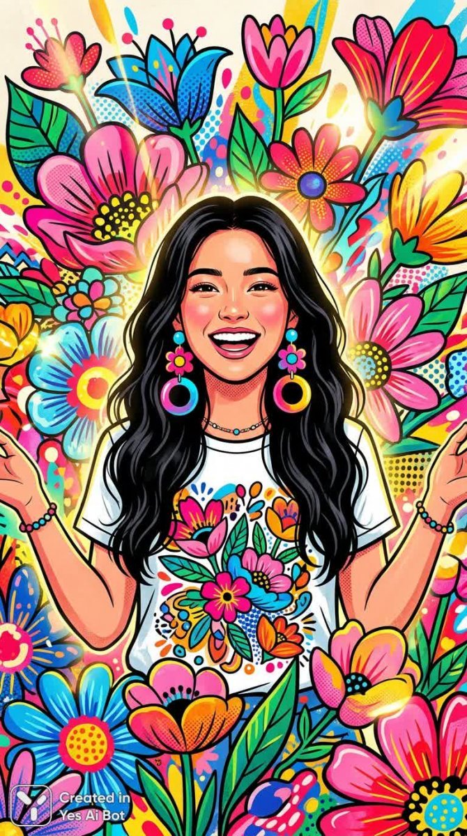 girl with long black hair touching her shoulders, graphic shirt with a floral motif, cheerful expression, oversized earrings, standing amidst a burst of colorful abstract flowers, filled with light, pop-art style, vivid saturated colors.