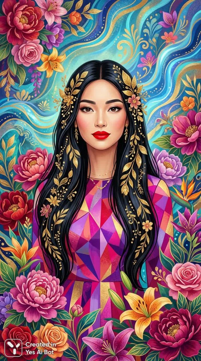 Изящная женщина с ниспадающими длинными черными волосами, украшенными золотыми листьями, воплощает собой элегантность и утонченность. Ее смелые, ярко-красные губы придают образу дерзости и уверенности. На ней – геометрически вычурный наряд в насыщенных розовых и фиолетовых тонах, создающий гармоничный контраст с ее спокойным выражением лица. Женщина обращена прямо к зрителю, излучая безмятежность и внутреннюю силу. Ее окружает пышный букет многоцветковых цветов, каждый из которых словно является произведением искусства. В абстрактном фоне закручиваются волны синего и золотого цвета, создавая ощущение глубины и загадочности. Эта работа выполнена в стиле художественной цифровой иллюстрации, отличающейся богатством красок и мягким освещением. Каждая деталь продумана до мелочей, от блеска волос до тонких переходов цветов на платье. Композиция создает впечатление гармонии и красоты, передавая зрителю атмосферу волшебства и вдохновения. Она словно ожившая картина, наполненная жизнью и эмоциями. Изображение воплощает собой идею женственности, силы и связи с природой, являясь настоящим шедевром цифрового искусства. Это визуальное произведение, которое заставляет задуматься о красоте мира вокруг нас и вдохновляет на творчество