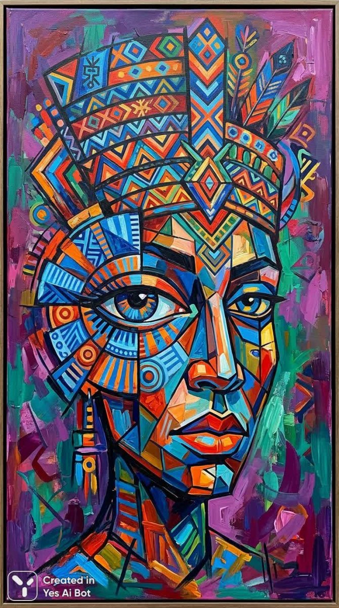 Яркий абстрактный портрет в кубистическом стиле с этническими мотивами и геометрией - Изображение, созданное нейросетью NanoBanana