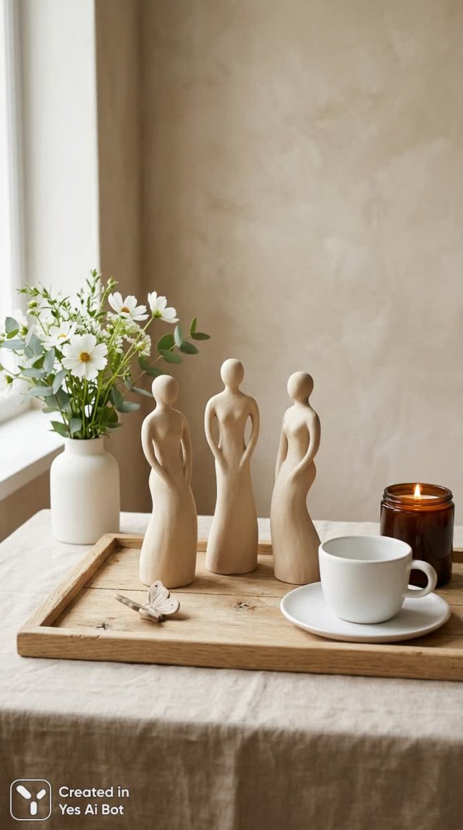 minimalist ceramic figures, three statuettes of faceless human figures with elongated curved limbs, cup and plate in bg, vase with white flowers, butterfly figurine, light wooden tray, aromatic candle in brown glass, soft daylight, neutral beige background