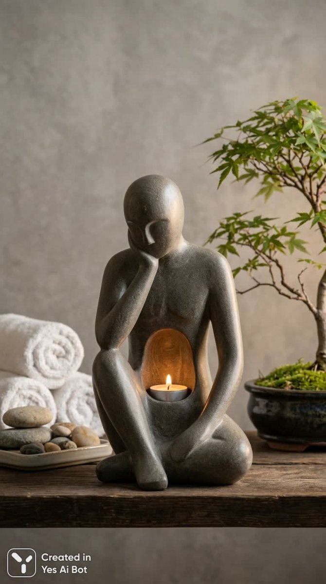 abstract sculpture of seated human in thinking pose, smooth stone texture, hole in abdomen with tiny candle inside, rolled white towels and decorative stones in background, mini bonsai nearby, warm soft lighting, neutral gray bg, photorealism