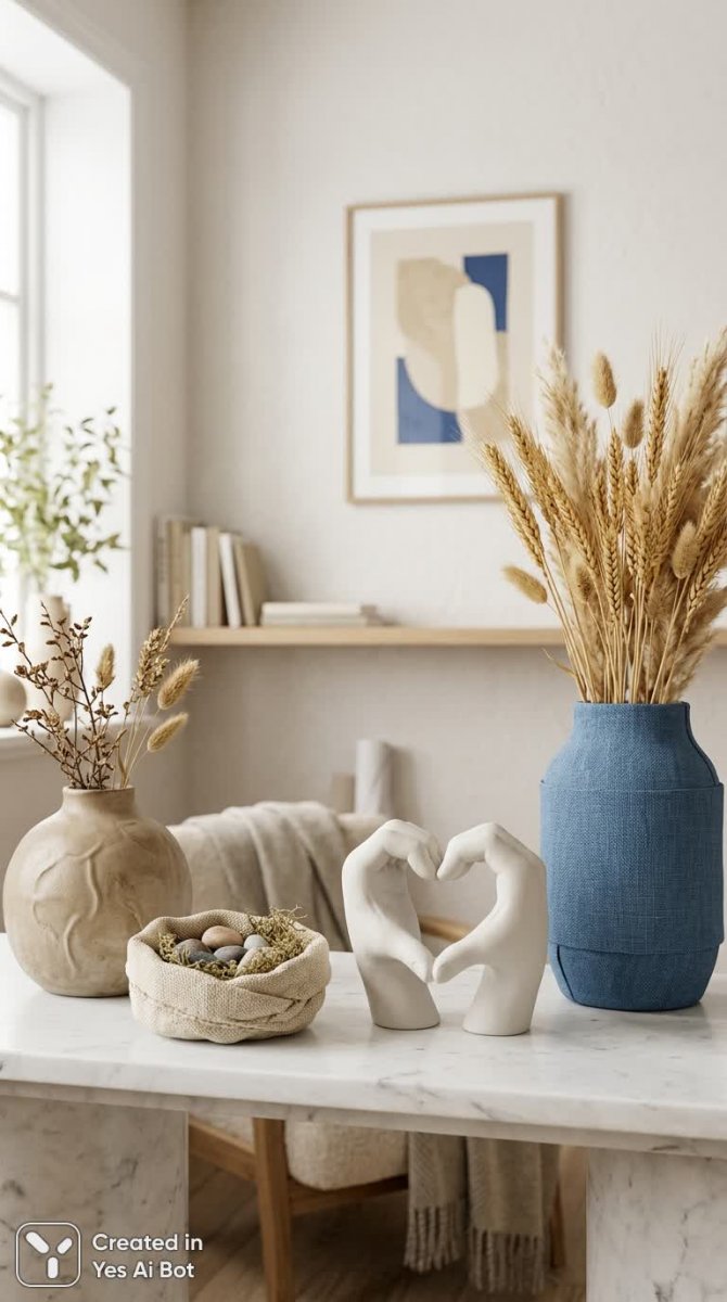 set of modern decorative vases in minimalist style, round beige vase with relief, large blue vase with fabric texture and dried wheat, white ceramic hands forming heart, nest-shaped fabric holder, soft bright lighting, marble table, calm scandinavian interior, hq resolution