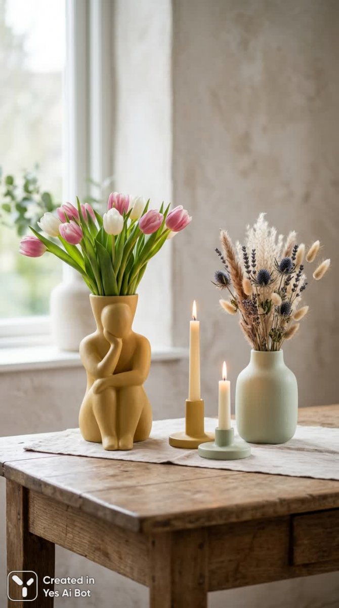 minimalist ceramic vases and candle holders, matte yellow and light green tones, one vase shaped like seated pensive faceless figure with tulips, dried flowers in blue fabric-textured vase, candles lit, soft diffused daylight, still life style, canon eos r5, rf 50mm f1.2l