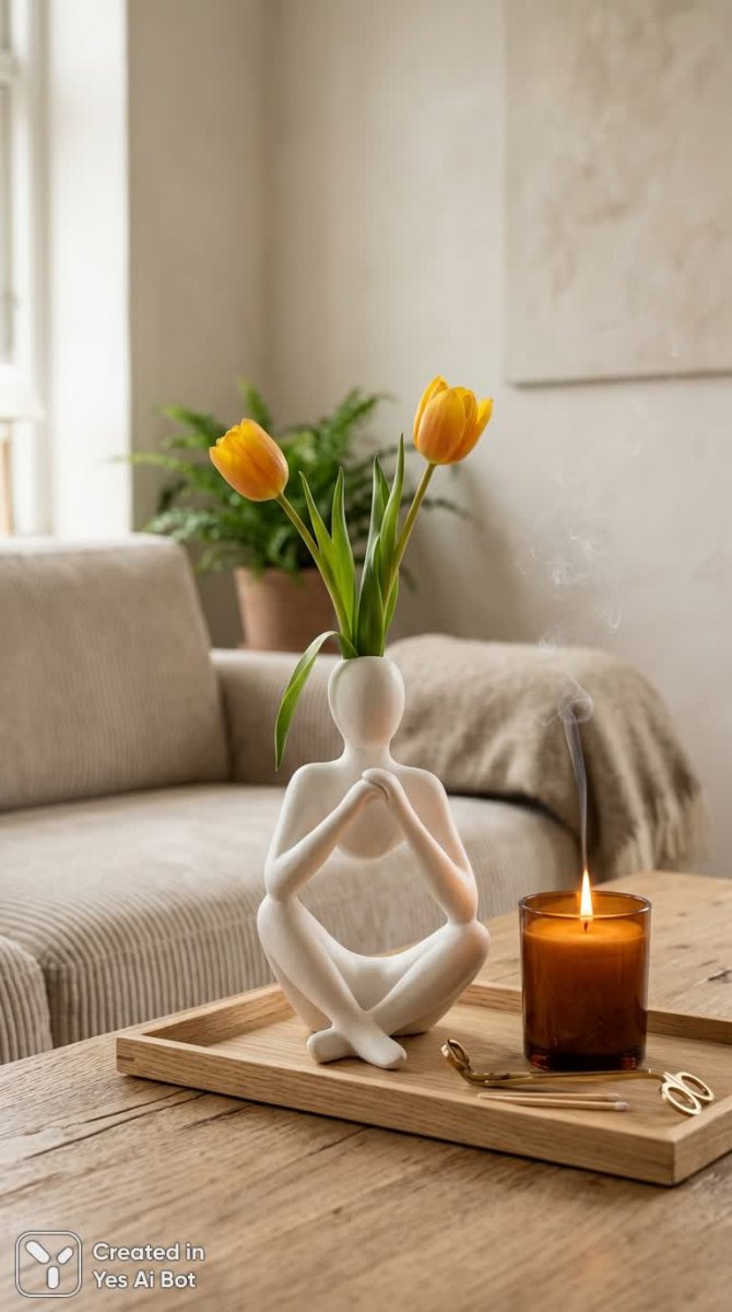 На изображении представлена скандинавская композиция, излучающая умиротворение и уют. В центре расположена необычная ваза белого цвета, стилизованная под сидящую фигуру человека с рельефной текстурой, в которой размещены два ярко-желтых тюльпана. Теплое освещение подчеркивает детали и создает расслабляющую атмосферу. Коричневый стеклянный подсвечник со свечой, от которой поднимается легкий дымок, добавляет романтичности. Все элементы гармонично расположены на светлом деревянном подносе. Камера зафиксировала сцену спереди, обеспечивая полный обзор тщательно продуманной композиции из форм и текстур. Изображение отражает эстетику скандинавского стиля, ценящего простоту, функциональность и натуральные материалы, создавая ощущение гармонии и спокойствия, идеально подходящее для современного интерьера. Нейросеть Nano Banana v.2.0 использована для генерации этого изображения по запросу, включающему описание вазы, цветов, свечи, подноса, освещения, стиля и ракурса съемки.