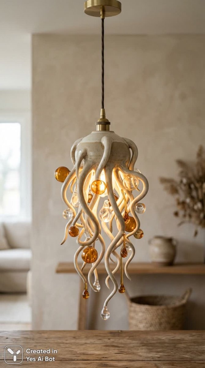 suspended medusa-like lamp, translucent ceramic and glass, soft warm lighting, neutral tones, minimalist decor, smooth organic shapes, blurred bg, still life style, high-quality photo