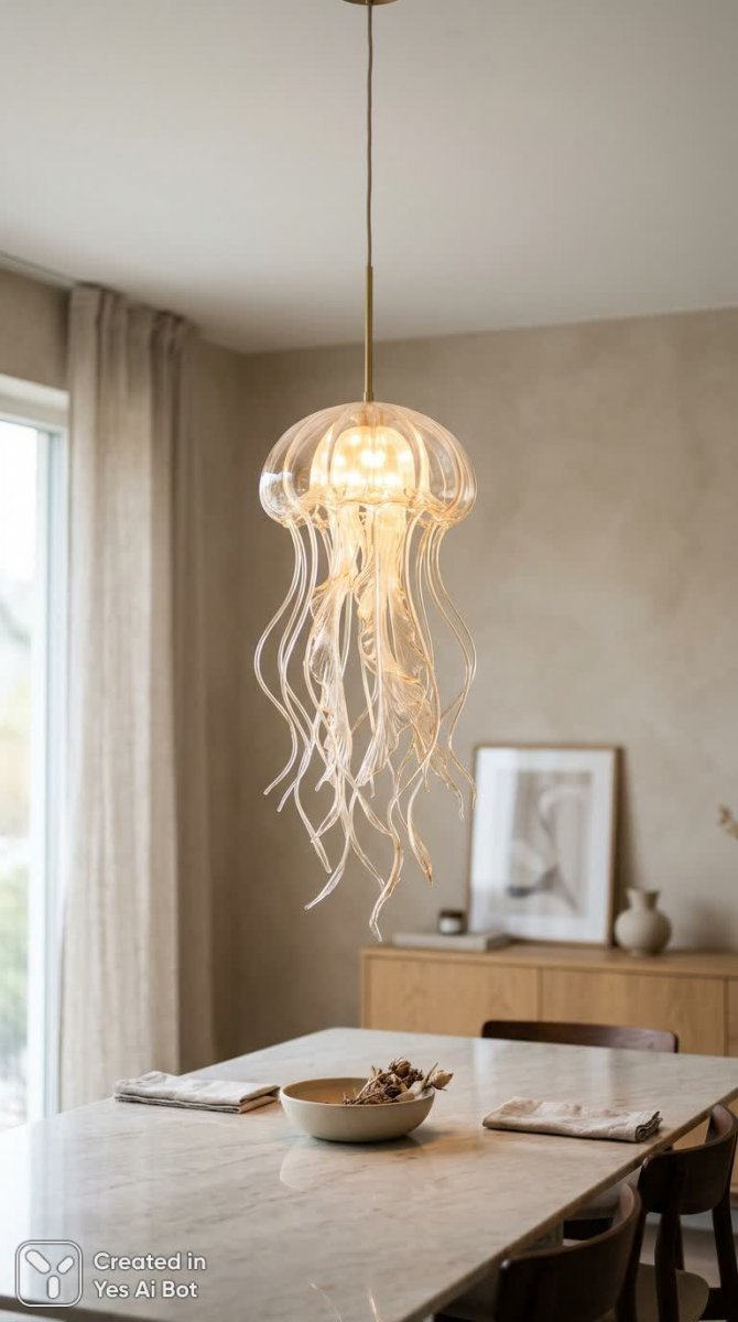 jellyfish chandelier, glass tentacles flowing, soft warm lighting, neutral beige bg, minimalist modern interior, hanging above smooth marble table, cozy atmosphere, photorealism, blurred bg, high-quality photo.