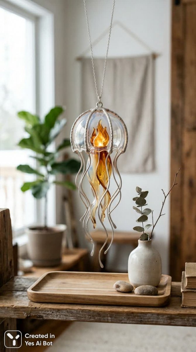 abstract jellyfish pendant, glass and textured metal, glowing center like candle flame, smoke-like light rays, smooth lines, light wooden tray below with small ceramic vase, soft daylight illumination, cozy minimalist room, canon eos r5.