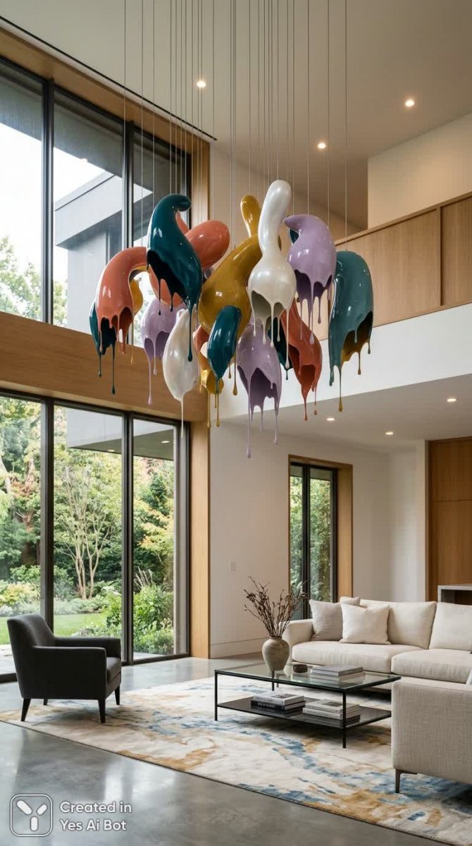 A cinematic, contemporary interior showcasing a sculptural chandelier as the focal point: a cluster of abstract, streamlined organic forms in varied hues—deep teal, coral, mustard, soft lavender, and pearl white—each piece finished in high-gloss lacquer and resin, their lower edges imperfect with elegant paint-like drips and slow pooling streaks that catch the light. The chandelier hangs low in a double-height living space with matte white walls, warm oak accents, and a polished concrete floor that subtly reflects the colorful forms. Soft natural daylight pours through floor-to-ceiling windows, mixed with warm recessed LEDs that create gentle...