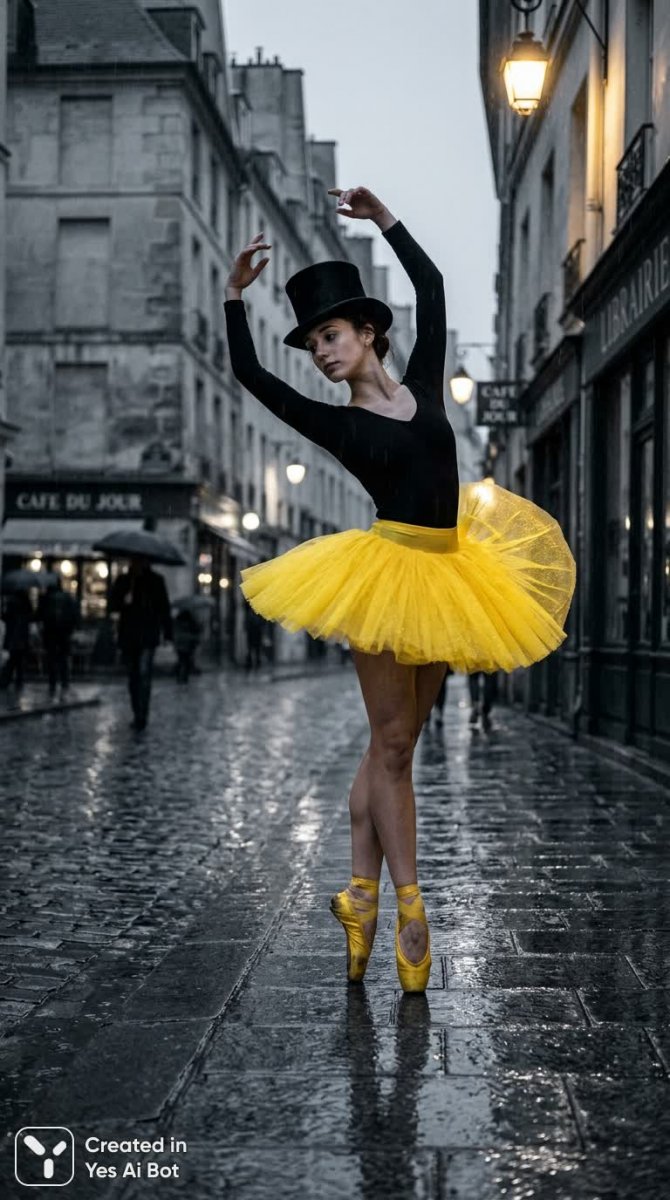 A cinematic, melancholic street scene in a gray monochrome city during steady rain: a slender ballerina-model dances alone in the wet avenue, wearing a stark black bodice and a vivid, bright yellow tutu and matching yellow pointe shoes that create a sharp visual contrast against the muted surroundings. She balances en pointe, muscles taut, expression wistful and distant, a tall black top hat perched improbably on her head. Reflections shimmer in puddles, rain streaking down shop windows and streetlamps casting soft halos through mist. Textures: slick cobblestones, dripping umbrellas, satin of the tutu catching feathery highlights, subtle rain-soaked fabric clinging to her silhouette. Mood: haunting melancholy, graceful defiance, solitude. Lighting: cool, diffused overcast with a single warm streetlight backlighting her yellow skirt to make it glow like a small sun in the gray. Color palette: desaturated grays and slate blues, with a saturated canary yellow focal accent. Composition: mid-shot, slightly low angle to emphasize her elevation and the hat, centered yet slightly off to the right to show receding wet street and blurred pedestrians in the background as soft silhouettes. Artistic accents: cinematic shallow depth, painterly rain streaks, high-detail textures on the tutu and worn pointe shoes, subtle film grain for nostalgic atmosphere.