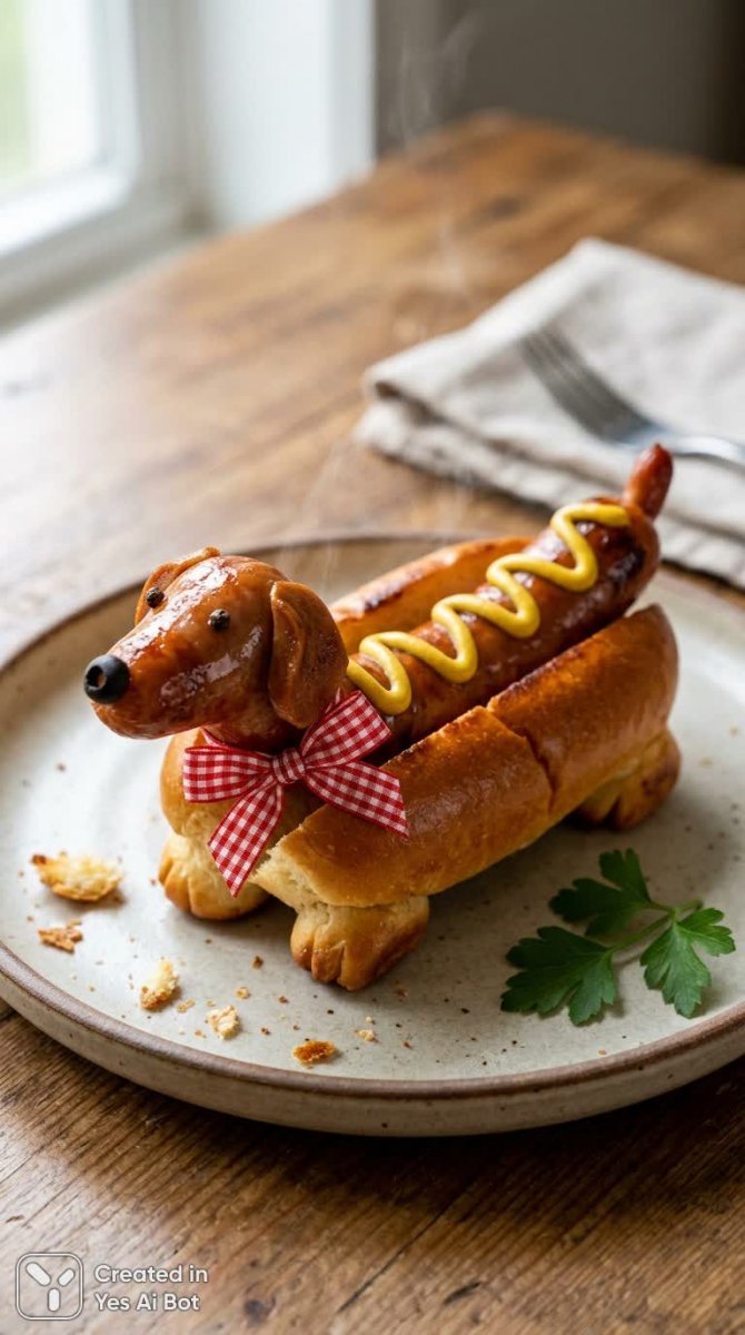 A hyper-realistic food photograph of an adorable hot dog crafted to look like a cute dachshund: a glossy sausage sculpted and browned like a real dog body, nestled in a soft toasted bun shaped subtly like dachshund legs and tail. A neat wavy line of bright golden mustard runs along the sausage like fur pattern. Around the dog’s neck, a small, tidy bow made from red-and-white checkered satin ribbon sits perfectly centered. Studio food-photography styling, soft natural window light from the side, warm highlights on the glossy sausage, delicate steam rising to suggest freshness. Neutral shallow-depth-of-field, matte ceramic plate with a few play...