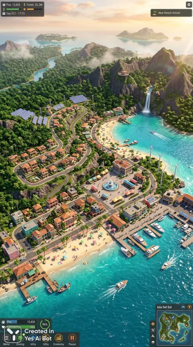 Представляем захватывающий кадр из видеоигры, демонстрирующий процветающий город, гармонично вписанный в живописный тропический пейзаж. Вид сверху, с небольшим изометрическим углом, открывает панораму прибрежного города, где современные постройки и природная красота сливаются воедино. Изогнутые пальмовые аллеи ведут к песчаным пляжам, усыпанным зонтиками для отдыха, а разноцветные невысокие курорты приглашают окунуться в атмосферу безмятежности. Деревянные пирсы и оживленный порт с рыбацкими лодками создают ощущение динамичной жизни, дополняемое мариной с изысканными яхтами. Жилые районы террасного типа плавно переходят в рыночные площади, где кипит торговля, а центральная площадь города украшена фонтаном. В глубине острова раскинулись густые изумрудные джунгли, извилистая горная цепь с живописной смотровой площадкой и водопады, ниспадающие в кристально чистые лазурные бухты. Дороги и тропы изящно огибают рельеф местности, усеянные ветряными турбинами и солнечными панелями, демонстрируя гармоничное сочетание современных технологий и островной эстетики. Мягкий свет позднего дня заливает все вокруг теплыми оттенками, отбрасывая длинные тени и создавая легкое сияние на водной глади. Блестящие блики солнца танцуют на волнах, а тонкая дымка над горизонтом добавляет глубины и реалистичности изображению. Цветовая палитра богата и насыщенна: лазурный океан, золотистый песок, сочные зеленые оттенки джунглей, теплые терракотовые и пастельные тона зданий создают неповторимую атмосферу уюта и гостеприимства. В углу экрана расположены минималистичные элементы интерфейса игры – небольшие индикаторы ресурсов и мини-карта, не загромождающие обзор и сохраняющие аутентичность скриншота. Композиция сбалансирована для обеспечения четкости и глубины изображения, а высокая детализация растительности и ряби на воде придает сцене невероятную реалистичность. Мягкая глубина резкости на горизонте усиливает ощущение пространства, а общее настроение – радостное и располагающее к исследованию. Этот кадр демонстрирует кинематографический 3D-реализм видеоигры, погружая зрителя в мир красоты и приключений