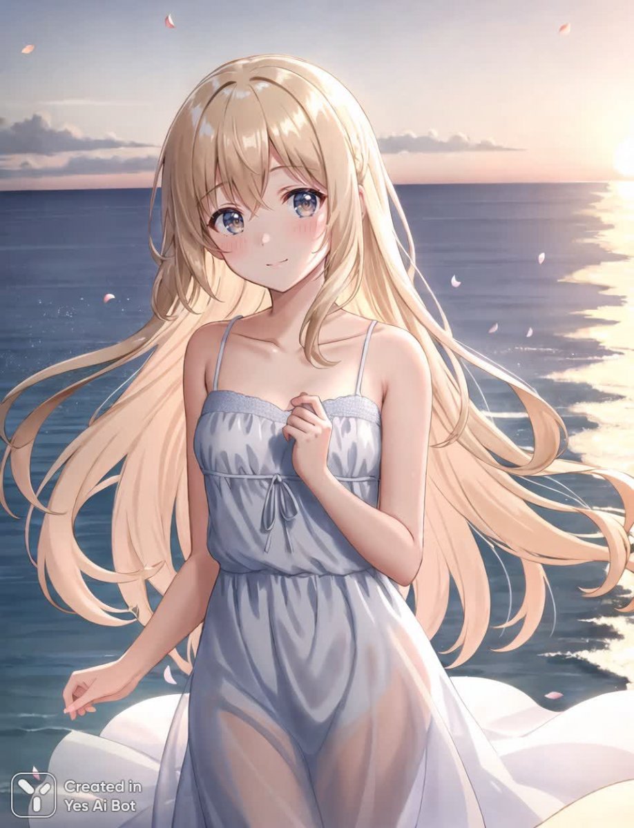 Нежная и трогательная иллюстрация в стиле аниме изображает юную девушку, застывшую в моменте у моря на закате. Золотой час окрашивает все вокруг мягкими тонами, создавая атмосферу мечтательности и романтики. Легкий бриз играет с ее длинными волосами и воздушным платьем, подчеркивая хрупкость и невинность образа. Ее лицо освещено теплым светом заходящего солнца, на щеках заметен легкий румянец, а в больших выразительных глазах отражается красота закатного неба. Изображение выполнено с поразительным вниманием к деталям, сочетая кинематографический реализм и характерные черты аниме-стиля – тонкие линии, плавные переходы теней и деликатная цветовая палитра персикового, розового и морского цветов. Фоном служит спокойный океан с мерцающими волнами, уходящий вдаль к горизонту, где парят одинокие чайки и легкие облака, купающиеся в лучах заката. Композиция выстроена по правилу третей, создавая гармоничный и уравновешенный образ. На переднем плане видны нежные лепестки цветов и размытые силуэты прибрежной травы, добавляющие глубину и объем. Текстуры ткани, кожи, волос и мелкие веснушки передают тактильные ощущения, делая изображение максимально реалистичным. Вся сцена пронизана атмосферой нежности, надежды и легкой грусти, заставляя зрителя почувствовать себя частью этого волшебного момента. Мягкое золотое освещение создает вокруг силуэта девушки ореол света, а деликатный эффект боке от отражения воды добавляет картинке особого шарма и очарования