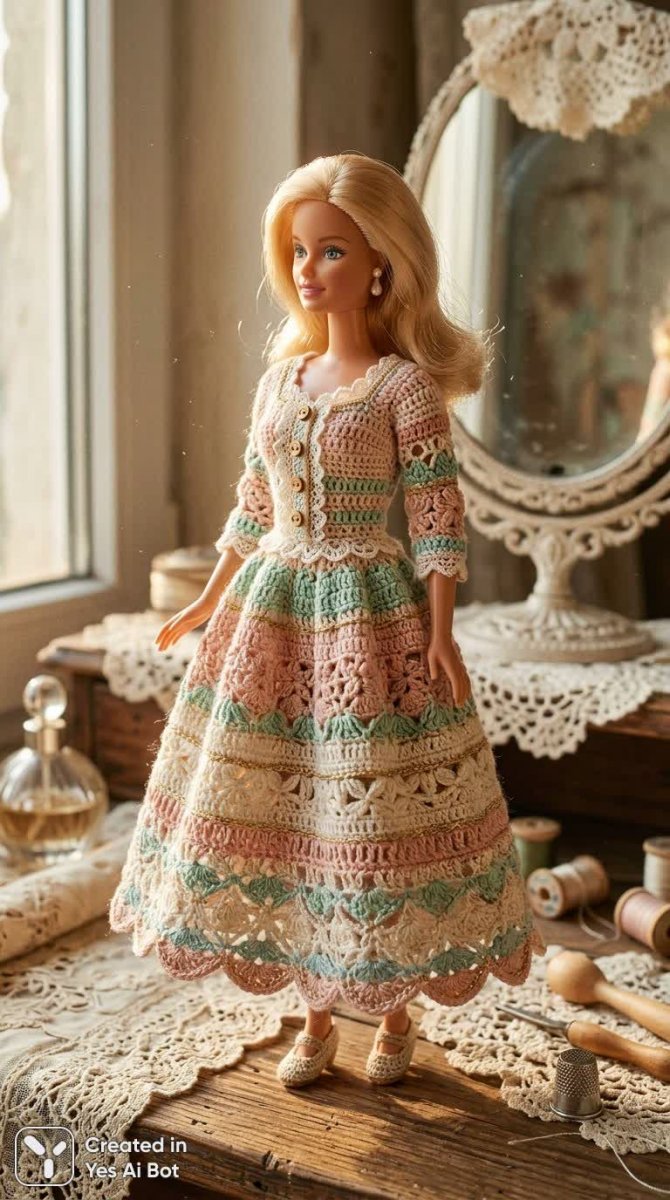 A fashion-editorial, highly detailed portrait of a classic Barbie doll wearing an intricate hand-crocheted dress, cinematic realism. The doll stands in a soft, sunlit vintage dressing room, three-quarter view, full outfit visible—delicate crochet stitches, scalloped lace hem, and tiny floral motifs rendered in fine, slightly fuzzy yarn texture. Pastel palette: blush pinks, cream, mint accents, with subtle gold trim. Warm, diffused late-afternoon light from the left creates gentle highlights on the doll’s glossy plastic skin and casts soft shadows that emphasize the weave and stitch depth of the dress. Composition balances close-up texture det...