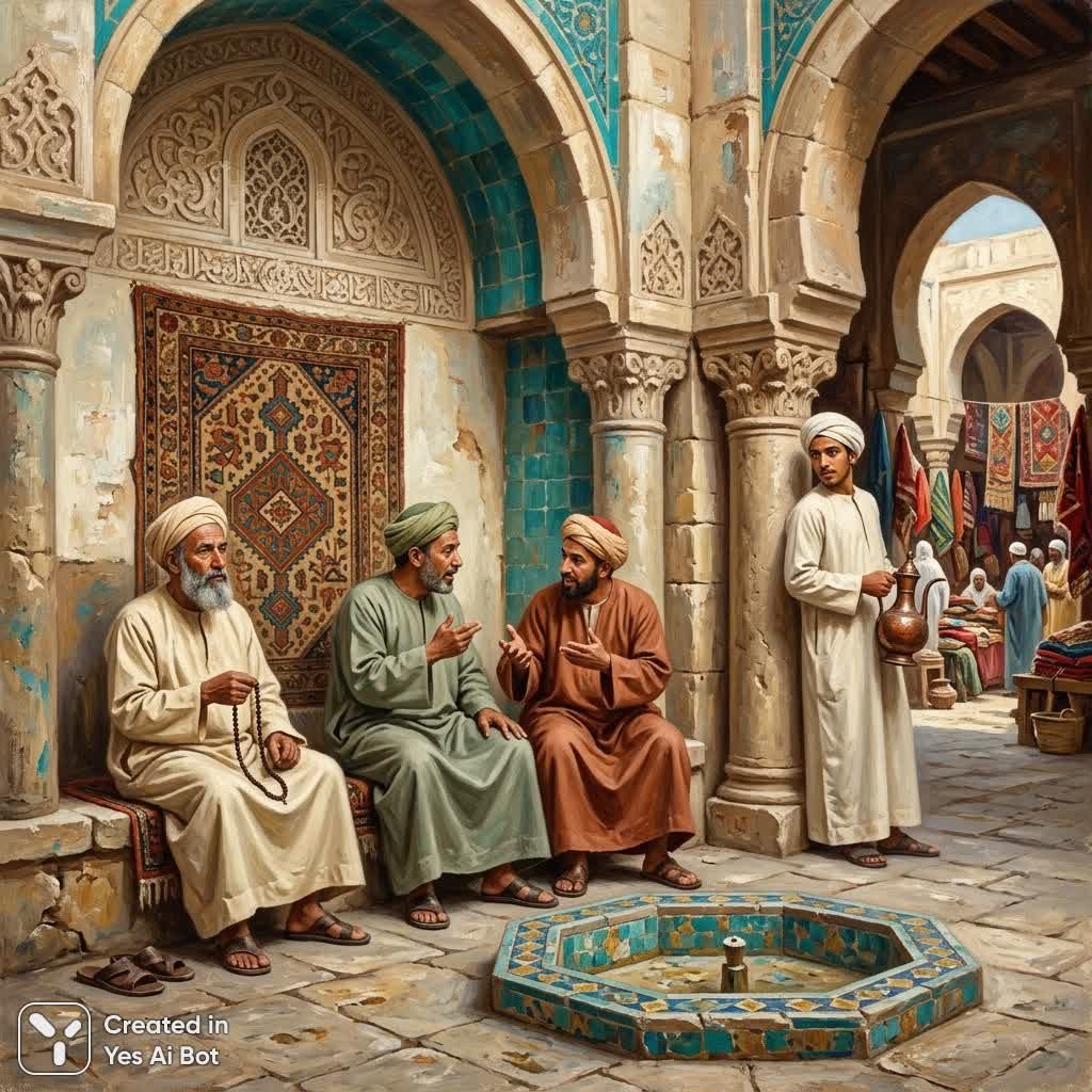 nanobanana Мудрые беседы в ближневосточном внутреннем дворе: оживлённая сцена из жизни. Изображение из нейронной сети NanoBanana