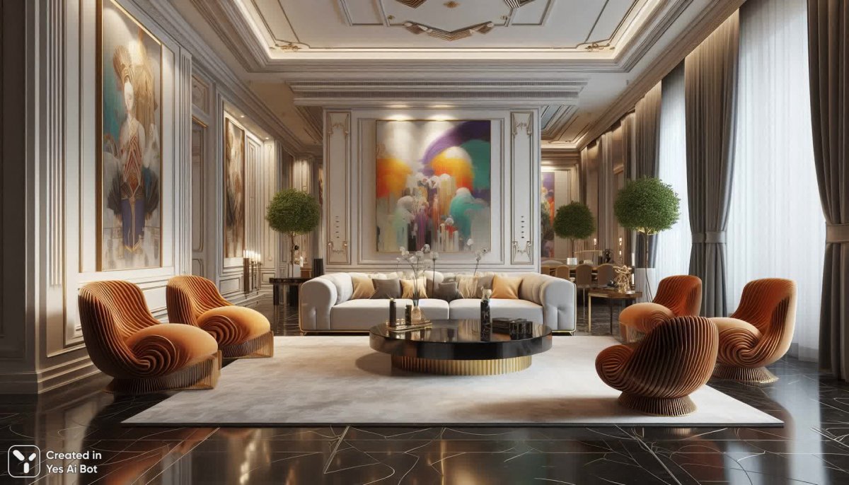 Интерьер в дофаминовом стиле, перспектива, гостиная с диваном и креслами необычной формы, палас, картины современное искусство на стенах, смешение стилей мидсенчури и ультра-современного.
