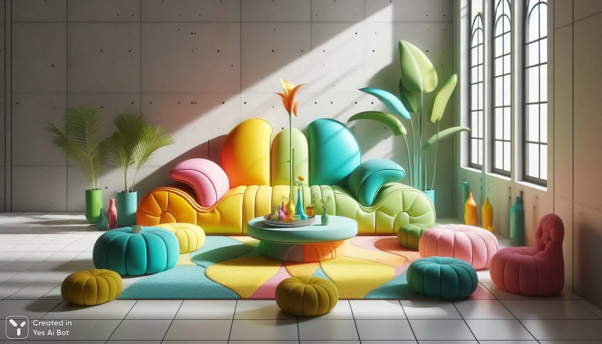 Необычный диван в дофаминовых оттенках, в солнечной гостиной, представляет из себя центральную фигуру, вокруг небольшие пуфики, перед диваном журнальный столик, на столике сервиз в оттенках дивана, добавь растений в горшках на полу, придумай что-то новое, это оптимистичный и неординарный интерьер. Перспектива с акцентом на диван.