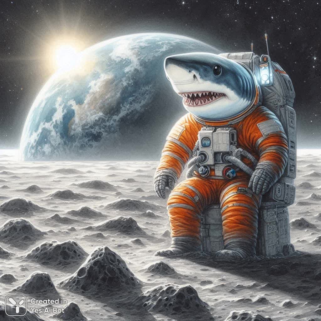 Акула-астронавт на Луне: удивительный шедевр в технике акварели и графита - Картинка, сгенерированная нейросетью Dalle 3