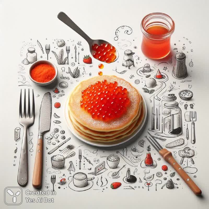 Изысканное визуальное представление блюда для меню уютной кафешки. На фотографии – воздушные блины с икрой лососевого сорта, расположенные на светлом, лаконичном фоне, подчеркивающем их аппетитность. Дополнительный шарм композиции привносят игривые ручные элементы: графически изображенное столовое серебро – вилка, нож и ложка – взаимодействуют с реальным блюдом в неожиданных сюжетах. Вилка словно берет кусочек икры, ложка высыпает содержимое на блины, а миниатюрная соленица щедро посыпает их специями. В рисунках присутствуют мелкие детали: затейливые завитки, направляющие стрелки, забавные персонажи и небольшие сценки, которые добавляют легкости и юмора. Название блюда выделено крупным, смелым шрифтом в верхней части изображения, без излишних пояснений – акцент сделан на визуальное восприятие. Вся композиция излучает яркость, динамичность, стиль и позитивное настроение, где реальная еда гармонично сочетается с живыми, креативными элементами ручной графики, создавая неповторимый художественный образ, пробуждающий аппетит и желание попробовать это восхитительное лакомство. Это не просто фотография блюда, а настоящее произведение искусства, которое рассказывает историю вкуса и радует глаз своей оригинальностью