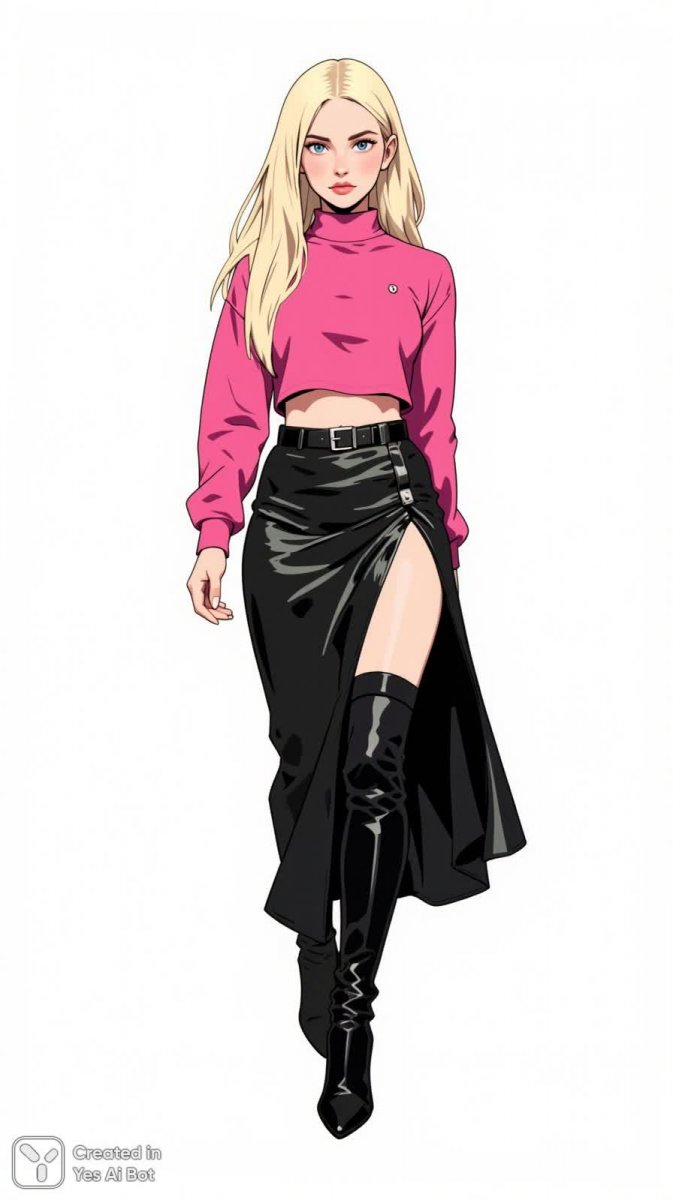 Изящная блондинка уверенной походкой скользит по городскому пейзажу, воплощая в себе дерзкий и современный стиль. Ее образ – это гармоничное сочетание нежности и силы, игривости и элегантности. Нежно-розовый топ с длинными рукавами и высоким воротником создает контраст с ниспадающей металлической черной юбкой, эффектно разрезанной до бедра. Тонкий черный пояс подчеркивает талию, добавляя образу четкости и графичности. Высокие черные сапоги выше колена завершают ансамбль, придавая ему нотку бунтарства и уверенности. Длинные прямые волосы плавно обрамляют лицо, усиливая ощущение легкости и свободы. Фон – чистый белый, позволяющий полностью сосредоточиться на модели и ее безупречном стиле. Этот образ излучает энергию большого города, сочетая в себе смелость, изысканность и современную эстетику. Он идеально подходит для тех, кто ценит индивидуальность и не боится экспериментировать с модой, стремясь выразить свою уникальную личность через яркий и запоминающийся стиль. Это воплощение современной городской элегантности, где каждая деталь тщательно продумана для создания неповторимого впечатления