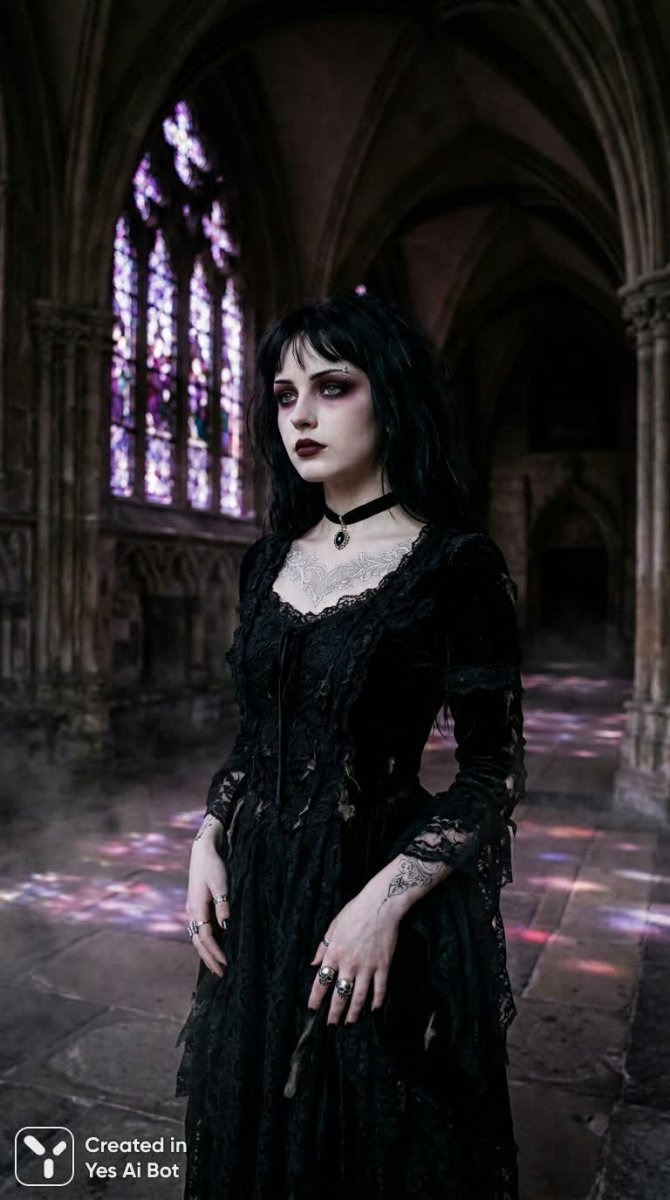 A cinematic, gothic portrait of a young goth woman, pale porcelain skin contrasted with raven-black hair, wearing intricate black lace dress and velvet choker with a small onyx pendant. She stands in a dim, vaulted cathedral-like interior with stained glass casting fractured amethyst and blood-red light across her face, soft fog drifting at floor level. Her expression is serene and aloof, eyes rimmed in charcoal and deep plum, lips matte dark burgundy, a single delicate silver eyebrow cuff glinting. Textures richly detailed: worn leather gloves, subtle lace tears, faint silver filigree tattoos on her collarbone. Moody, high-contrast lighting ...