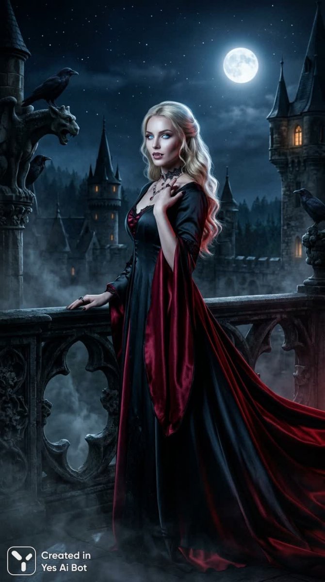 Завораживающий кинематографичный портрет роскошной блондинки-вампирши, чьи глаза излучают неземное сияние – светящиеся льдинсто-голубые зрачки, источающие мягкий внутренний свет. Она стоит на балконе замка, залитого лунным светом, воплощая собой элегантную и опасную красоту. Ее фарфоровая кожа, подчеркнутая слегка удлиненными клыками, создает впечатление хрупкости и вечной молодости, а роскошная фигура облачена в струящееся темное шелковое платье с подкладкой из темно-красного атласа, играющего бликами света. Сцена представляет собой гармоничное сочетание готической моды и темного фэнтези: вокруг балюстрады клубится туман, на заднем плане видны далекие зубцы замка под звездным небом, а в тенях скрываются вороны – символы мрачной таинственности. Драматическое освещение с высоким контрастом подчеркивает красоту и загадочность образа: холодный лунный свет высветляет ее волосы и скулы, создавая эффект сияния, а теплый бордово-красный отблеск снизу акцентирует платье и создает зловещее свечение. Богатая текстура – гладкие пряди волос, нежный кружевной воротник, полированный камень, слегка отражающие влажные поверхности – доминируют в палитре, где глубокие черные тона переплетаются с ледяными голубыми и насыщенными бордовыми акцентами. Композиция выдержана в трехчетвертном ракурсе: уверенная поза, слегка повернутое тело, одна рука покоится на перилах, другая нежно касается ключицы, а выражение лица сочетает в себе соблазнительность и царственное достоинство. Изображение отличается исключительной детализацией, элегантностью, атмосферой, загадочностью и погружает зрителя в мир готического реализма и темного фэнтези, где красота переплетается с опасностью, а вечная молодость соседствует с мраком. Это воплощение силы и грации, запечатленное в моменте вне времени