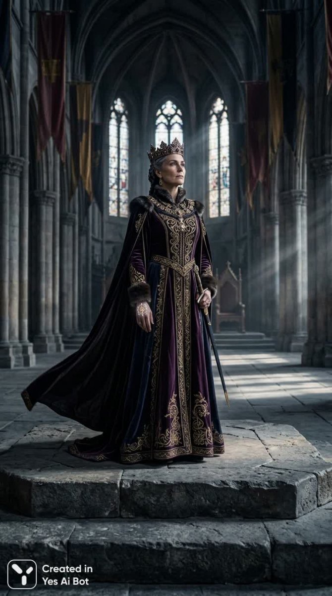 В величественном полумраке древнего тронного зала одиноко возвышается королева. Это портрет, выполненный в стиле кинематографического реализма – снизу вверх, чтобы подчеркнуть ее внушительность и власть. Высокая, царственная женщина стоит на каменном постаменте, окруженная лишь тишиной и бледным светом, проникающим сквозь витражные окна. Ее роскошное платье из бархата глубокого пурпурного и ночного синего цвета украшено золотой вышивкой и меховым воротником, а на голове покоится изящная корона из молотого золота и темных камней, гармонирующая с серебристо-черными косами ее волос. Выражение лица королевы – это сочетание гордости и задумчивости, спокойной уверенности в себе. Она словно воплощение власти и мудрости, хранительница древних тайн. Развевающиеся остатки знамен, висящие на растрескавшихся балках, и танцующие в лучах света пылинки создают атмосферу упадка и одиночества, подчеркивая ее изолированность. Легкое свечение мистического символа над ее ладонью намекает на то, что она не только монарх, но и страж древней магии. Мягкий теплый свет обрамляет силуэт королевы, контрастируя с холодными приглушенными тенями в зале. Цветовая палитра состоит из глубоких оттенков фиолетового, золотых акцентов, серого камня и приглушенного алого. Композиция выстроена таким образом, чтобы подчеркнуть величие момента: мощные колонны обрамляют фигуру королевы, а легкий ветер развевает ее плащ. Высочайшая детализация текстур – металла, ткани, камня – добавляет реализма и глубины этой картине торжественной мощи и одинокого величия