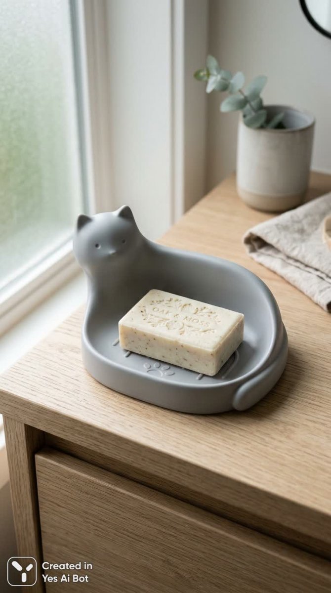 Изящная мыльница в форме кошки – минималистичный дизайн для ванной комнаты - Пример работы ИИ Нано Банана