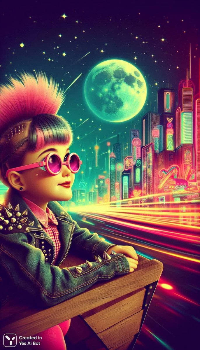 Retro masterpiece in pin-up style: a cute girl in stylish pink round glasses and a punk hairstyle, a leather jacket with spikes, dreamily looks up somewhere, sitting half-turned on a vintage bench close to us occupying the left part of the picture. In the background is a retro-futuristic night neon city, in the sky of which the planet rises and a huge moon occupies half the sky. Retro-future world, 1960s, colorful pin-up with watercolors and acrylics.