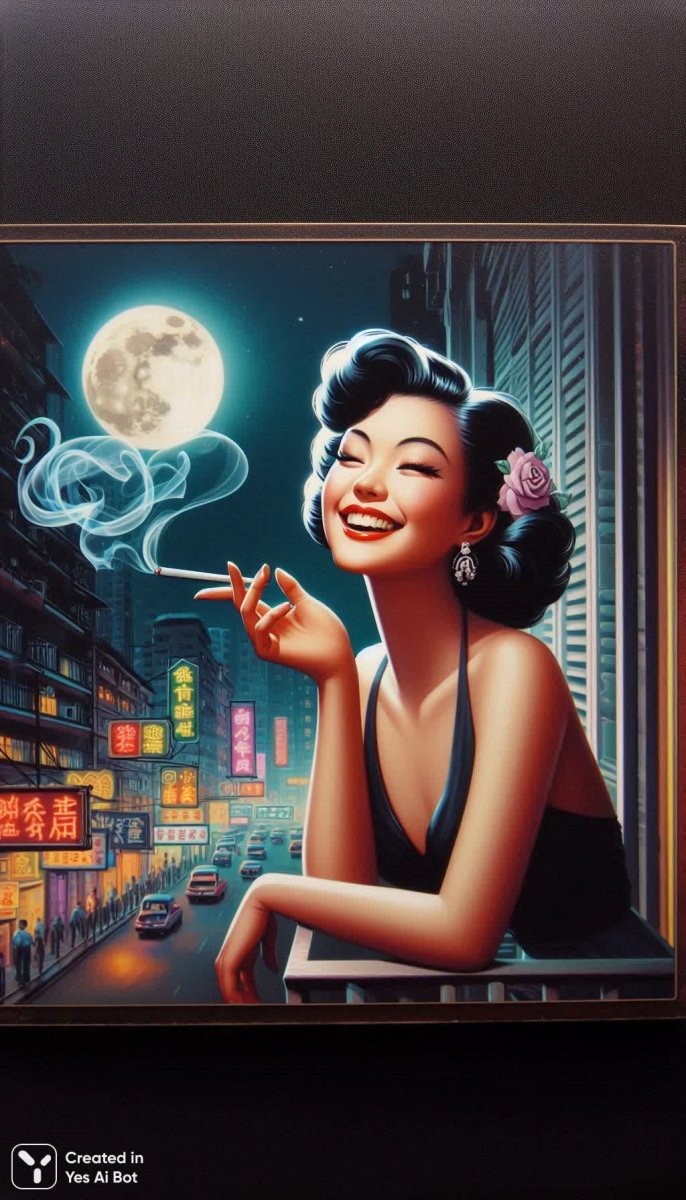 Acrylic pin-up masterpiece. Happy girl with Asian features on a balcony in Hong Kong, holding a thin, long cigarette with a bluish, ornate smoke, voluminous black hair, smiling, eyes closed with pleasure, a full moon peeking out from around the corner of the building, colorful neon night picture in pin-up style with a city view, retro, 1960s