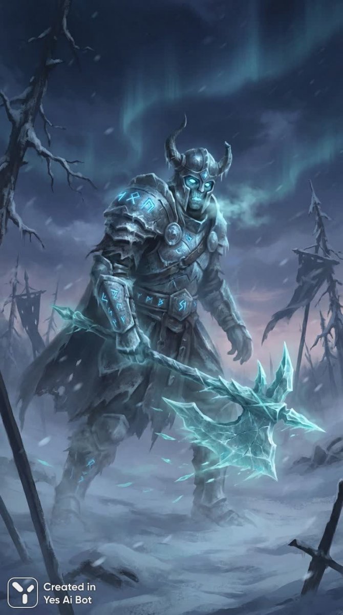 Завораживающая иллюстрация в жанре темного фэнтези представляет собой ледяного призрака-воина, вооруженного огромным топором изо льда. Это полупрозрачная, эфирная фигура, облаченная в разорванную, покрытую инеем броню с светящимися рунами, а их пустые глаза напоминают холодные синие тлеющие угли. Топор воина кристаллический и неровный, покрыт инеем и слабо излучает бледно-бирюзовый свет; из лезвия тянутся хрупкие осколки и морозный туман. Сцена разворачивается на продуваемом ветром замерзшем поле боя в сумерках, среди сломанных знамен и скелетоподобных деревьев, наполовину погребенных под снегом. Слабое северное сияние переплетается со штормовым индиго-небом. Мрачная и меланхоличная атмосфера подчеркнута кружащимся снегом и дрейфующими частицами льда, а мягкое боковое освещение выделяет призрачную прозрачность фигуры, создавая длинные жуткие тени. Цветовая палитра состоит из ледяных синих оттенков, бирюзового, серо-свинцового и серебряных акцентов. Высокодетализированные текстуры треснувшего льда, кристаллов инея и выветренного металла добавляют реалистичности изображению. Кинематографическая композиция с видом три четверти и слегка снизу подчеркивает древнее и внушительное присутствие воина, создавая ощущение динамичного движения сквозь пургу. Изображение пронизано настроением холода, неумолимости и печали, выполненное в высокодетализированном иллюстративном стиле, способном захватить дух зрителя своей таинственностью и красотой. Это визуальное воплощение ледяного ужаса и скорби на фоне заснеженного пейзажа