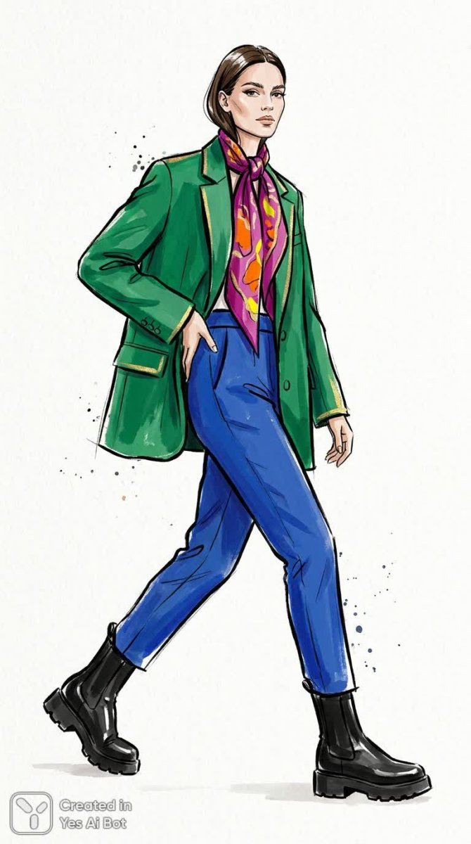 Изысканная двухмерная иллюстрация моды, выполненная в технике четкого графического рисунка и ручной росписи темперными красками, представляет собой уверенную в себе женскую модель в стильном современном наряде. Модель эффектно позирует на однотонном белом фоне, создавая ощущение чистоты и элегантности. Сильные контурные линии чернил подчеркивают силуэт и выразительные черты лица, а плавные мазки ярких темперных красок формируют смелые цветовые блоки и передают ощутимую текстуру краски на одежде. В деталях костюма можно выделить многослойный оверсайз-блейзер, высокие зауженные брюки, шелковый платок с абстрактным принтом и эффектные ботфорты. Ткани мастерски изображены с помощью изящной штриховки и мягких переходов темперных красок, имитирующих акварель. Композиция построена таким образом, чтобы показать фигуру в полный рост с небольшим поворотом в три четверти, одна рука уверенно лежит на бедре, а динамичная походка создает ощущение движения и энергии. Вся иллюстрация пронизана атмосферой современности, уверенности и редакционного шика. Мягкое, ровное студийное освещение позволяет сосредоточить внимание на ярких цветах и богатой текстуре, минимизируя тени. Цветовая палитра построена на насыщенных драгоценных тонах – изумрудном, кобальтовом, маджента – с добавлением цитрусовых акцентов – апельсинового и лимонного, а также едва заметными золотыми чернильными бликами на отделке. Художественные детали, такие как деликатные брызги чернил, видимая текстура бумаги, тщательно проработанные узоры на шарфе и продуманное использование негативного пространства вокруг фигуры, придают работе особый стиль и изысканность, подчеркивая ее ручную работу и современный характер. Это стильная, искусно выполненная иллюстрация моды, которая завораживает своей красотой и вниманием к деталям