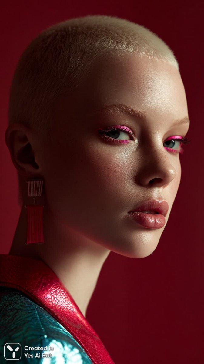 A high-fashion editorial portrait of an albino woman with a very short, sculpted buzz cut, porcelain skin and almost translucent eyelashes, styled for a glossy magazine cover. Avant-garde structured clothing — architectural shoulders, asymmetrical cut, mixed materials of matte neoprene and iridescent metallic panels — in a minimalist studio. Bright, graphic makeup: bold neon-pink eyeliner and electric blue shadow, glossy coral lips, luminous highlighter on cheekbones and brow ridge, statement metallic ear cuff. Cinematic studio lighting with a cool key light and soft warm rim light to emphasize skin texture and garment architecture, deep but ...
