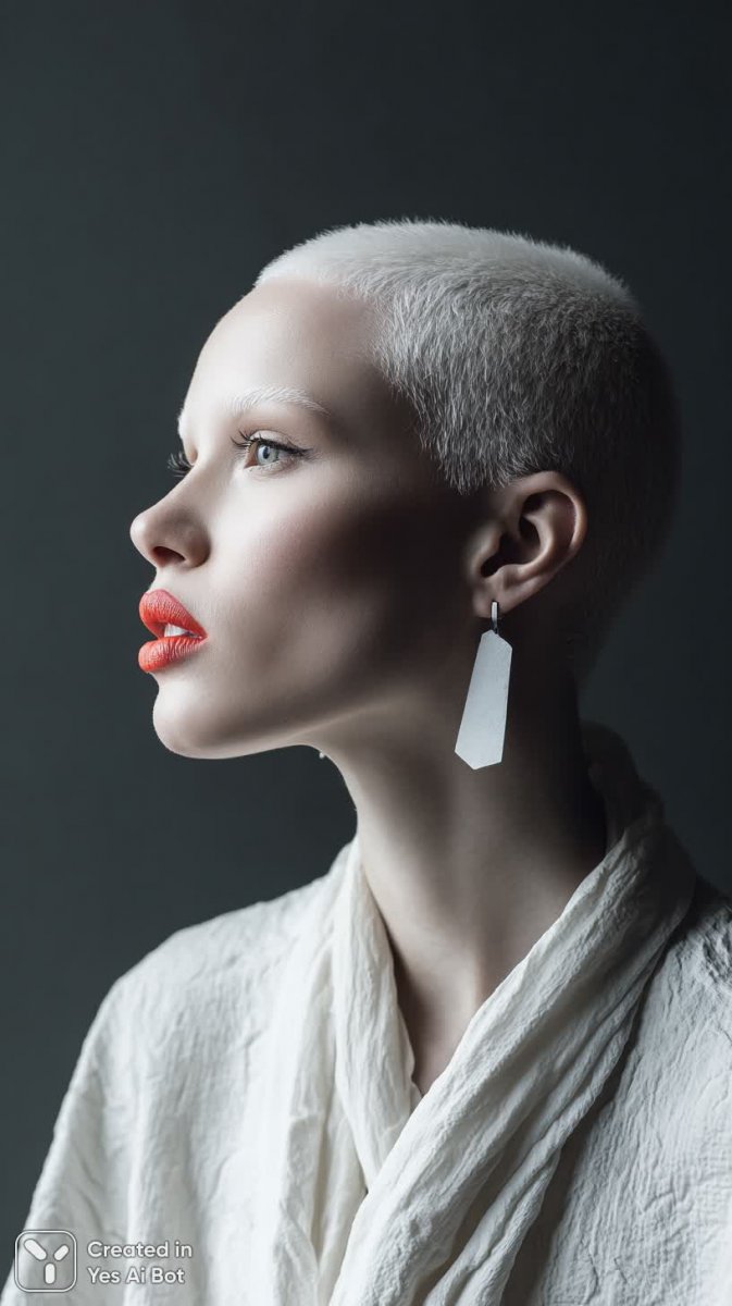Завораживающий портрет в стиле хай-фэшн демонстрирует альбиноску с дерзким ультракоротким ежиком и ярким макияжем. Электрический синий лайнер и неоново-коралловые губы подчеркивают безупречную фарфоровую кожу и ледяные белые брови, создавая эффектный контраст. Авангардный скульптурный наряд с асимметричными формами и сочетанием металлических и матовых текстур добавляет образу футуристичности и изысканности. Минималистичные геометрические серьги дополняют стильный ансамбль. Поза три четверти передает уверенность и силу, а студийная среда с нейтральным фоном усиливает драматический эффект. Направленный ключевой свет и мягкая контровой подсветка создают объем и глубину, подчеркивая тонкие блики на скулах и губах. Цветовая палитра из слоновой кости, кремовых оттенков и насыщенного черного акцентирована яркими неоновыми вставками, добавляя динамизма и современности. Этот портрет – воплощение кинематографического реализма с безупречным стилем, достойным глянцевого журнала, с тщательно выверенной ретушью, передающей ощущение современной красоты и элегантности. Это мощный образ, пронизанный уверенностью и эстетическим совершенством, демонстрирующий новаторский подход к красоте и моде