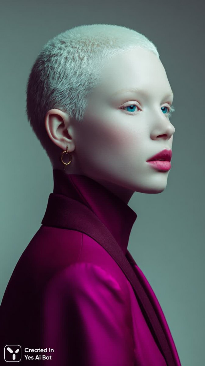Изысканный портрет в стиле высокой моды, запечатлевший альбиноску с дерзкой ультракороткой стрижкой. Яркий графический макияж в насыщенных электрических синих и фуксия оттенках создает эффектный контраст с фарфоровой кожей модели. На ней представлен авангардный наряд с выразительными скульптурными силуэтами и металлическими акцентами, демонстрирующий смелое сочетание фактур и форм. Фотография выполнена в студийных условиях для глянцевого журнала, отличается кинематографической реалистичностью и безупречной композицией. Минималистичный фон приглушенного серого цвета служит идеальным фоном, подчеркивая нежность кожи и выделяя детали костюма. Мягкий драматический свет с холодным контурным освещением акцентирует линии тела и создает объемные тени, добавляя изображению глубину и выразительность. Взгляд модели уверенный и прямой, поза элегантная и угловатая, что придает портрету ощущение силы и достоинства. Текстуры атласа и жесткого неопрена создают интересный контраст, а деликатные прозрачные аксессуары добавляют образу легкости и изящества. Отшлифованная глянцевая отделка и едва заметный эффект зернистости пленки придают фотографии современный и внеземной вид. В целом, портрет создает атмосферу утонченности и вдохновляющей силы, демонстрируя смелый взгляд на моду и красоту, сочетая в себе современность и загадочность, создавая неповторимый и запоминающийся образ. Изображение излучает уверенность, элегантность и ощущение безграничных возможностей, воплощая собой идеал современной модной фотографии