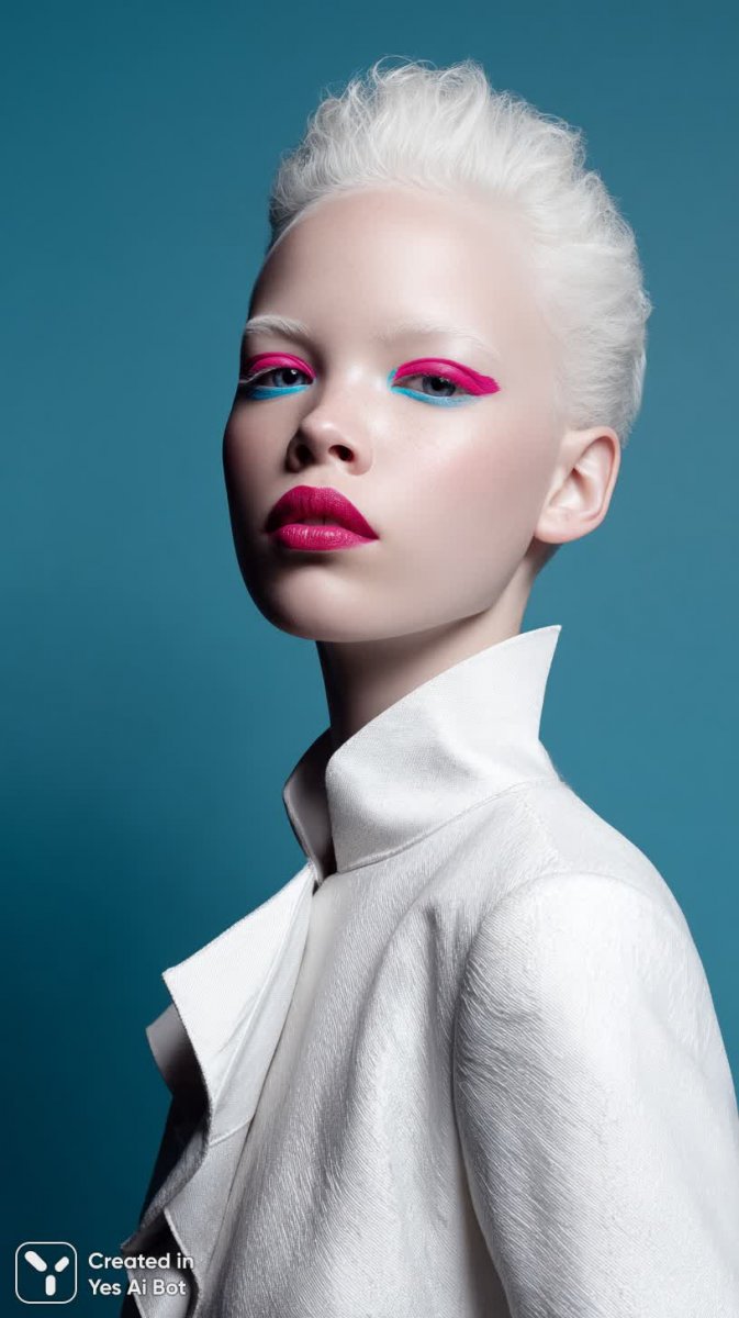 Элегантный и дерзкий портрет высокой моды демонстрирует альбиноса с ультракоротким ежиком. Яркий макияж в неоновых тонах розового и электрического синего оттеняет смелость образа. Авангардная скульптурная одежда, сочетающая асимметричные формы глянцевого латекса и матовой шерсти, создает ощущение футуристической изысканности. Студийное пространство с минималистичным фоном и ненавязчивыми архитектурными деталями подчеркивает утонченность композиции. Модель излучает уверенность и грацию, ее прямой взгляд пронизывает зрителя. Кинематографическое освещение с мягким ключом и резкой контровой подсветкой акцентирует бледную полупрозрачную кожу и выразительную структуру костей. Резкий цветовой контраст между алебастровым цветом кожи, насыщенным макияжем и одеждой добавляет драматизма. Высокая детализация текстуры кожи и безупречная ретушь подчеркивают безупречность красоты. Игра теней придает снимку глубину и загадочность. Современная композиция для модного журнала передает настроение элегантной провокации. Изображение излучает смелость, новаторство и высочайшее качество исполнения, отражая последние тенденции в мире моды и искусства. Эта работа — настоящее произведение современного искусства, сочетающее в себе красоту, силу и дерзкий стиль
