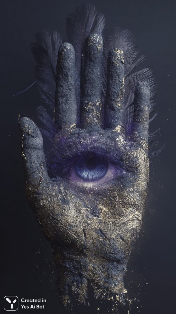 Загадочное и величественное произведение искусства, представляющее собой мистический сплав человеческой руки и Ока Гора – древнего символа защиты и мудрости. В центре композиции парит ладонь, обращенная вверх, в ее сердце сияет стилизованное око, излучающее божественный свет. Пальцы изящно вытягиваются и преображаются в перья ястреба, словно древние письмена, закручивающиеся в замысловатые узоры. Использованы роскошные текстуры: полированное золото, потрескавшийся базальт и сверкающая бирюза, создающие ощущение вечности и ценности. Тончайшая филигрань из древних иероглифов прослеживается по коже, словно шепот забытых знаний. Задний план погружен в сумеречную атмосферу – глубокий индиго неба с россыпью далеких звезд, а под ними простираются бесконечные охристые дюны и обломки древних каменных сооружений, наполовину погребенные в песках времени. Невидимые глазу жуки-скарабеи и едва различимые глифы испускают мягкое сияние лазурного цвета, добавляя изображению глубины и таинственности. Общее настроение пронизано чувством благоговейного трепета и вечной охраны. Композиция выдержана в равновесии, но слегка смещена от центра, создавая напряжение и динамику. Изображение поражает своей детализацией, тактильностью материалов, сложным металлическим блеском и нежной дымкой, танцующей в лучах света. Это завораживающее сочетание сюрреализма, выдержанное в церемониальном стиле, создает атмосферу таинственности и величия, перенося зрителя в мир древних мифов и загадок