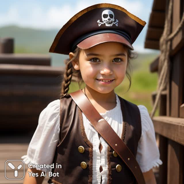 Смелая и отважная юная пиратка, едва достигшая семи лет, застыла в решительной боевой позе, словно готовая к схватке. Ее уверенный взгляд излучает непоколебимую храбрость настоящего морского воина. На ней надета аутентичная и грубая пиратская одежда: потрепанный коричневый кожаный жилет, простая белая хлопковая рубаха и старый пиратский колпак без излишеств. Никаких роскошных тканей, никакого золотого шитья, никакого бархата – лишь практичность и суровый дух морского разбойника. Черная повязка на правом глазу украшена отчетливо выделяющимся белым символом черепа и костей, придавая ей еще больше дерзости. В правой руке она крепко сжимает пиратский сабельный клинок, готовая дать отпор врагам. На левом плече сидит очаровательный озорной капуцин, добавляя образу юной пиратки немного игривости и непосредственности. В другой руке она уверенно держит пластиковую бутылку клубничного йогурта, словно это ее главный трофей или источник силы. Фон представляет собой деревянный палубный настил пиратского корабля, залитый ярким солнечным светом, создавая атмосферу захватывающего приключенческого боевика. Фотореалистичное изображение с кинематографическим освещением и невероятной детализацией в разрешении 8k позволяет полностью погрузиться в этот удивительный мир пиратских приключений и ощутить всю динамику происходящего. Эта картина – воплощение храбрости, отваги и духа свободы на фоне бескрайних морских просторов